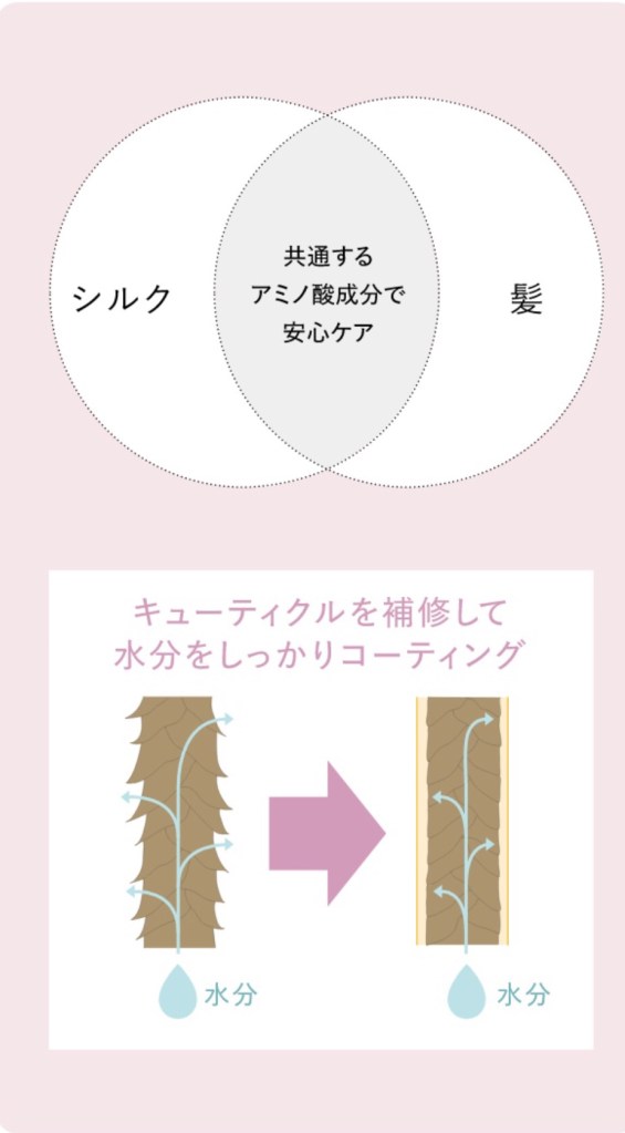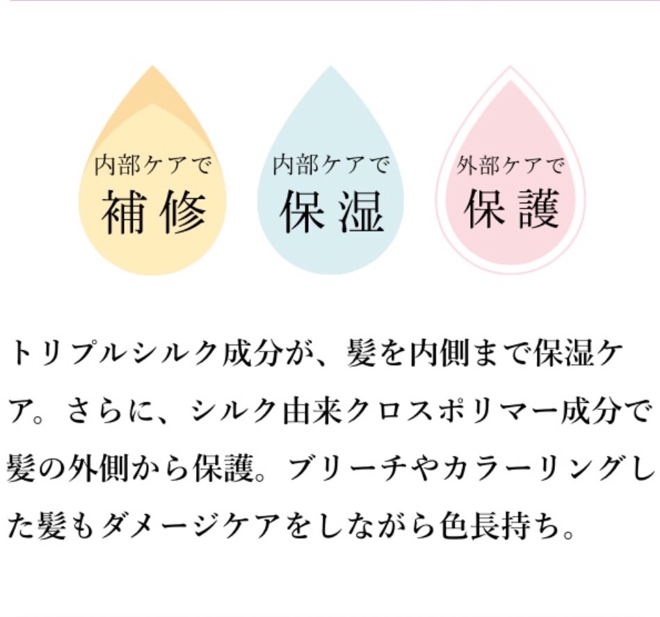 トリプルシルク(保湿)配合で髪に艶とまとまりを持たせることができます。