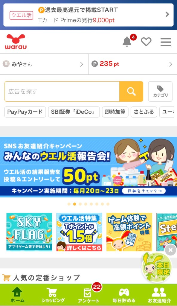 「ワラウ」は他のポイントサイトよりも貯めやすく