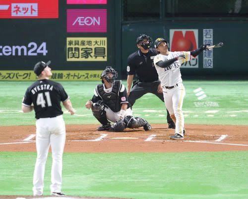 ホークスは一死1、2塁。山川穂高にレフトへタイムリーツーベースを放ち2-1と逆転。